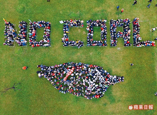 空污嚴重威脅國人健康,台灣健康空氣行動聯盟、南部反空污大聯盟發起台中、高雄反空污大遊行,逾8千民眾上街怒吼,台中場民眾排出台灣圖形及「NO COAL(無煤)」字樣。